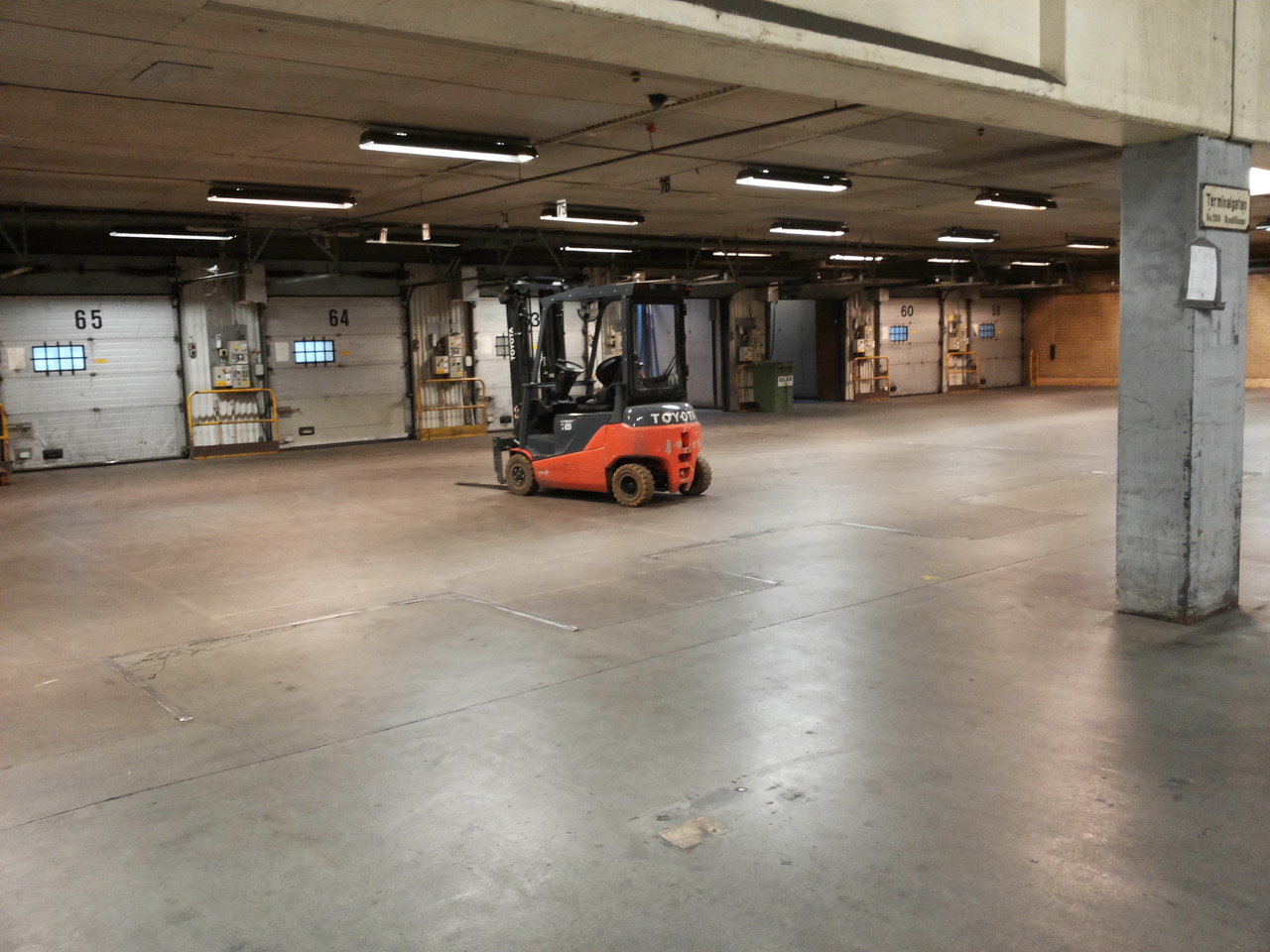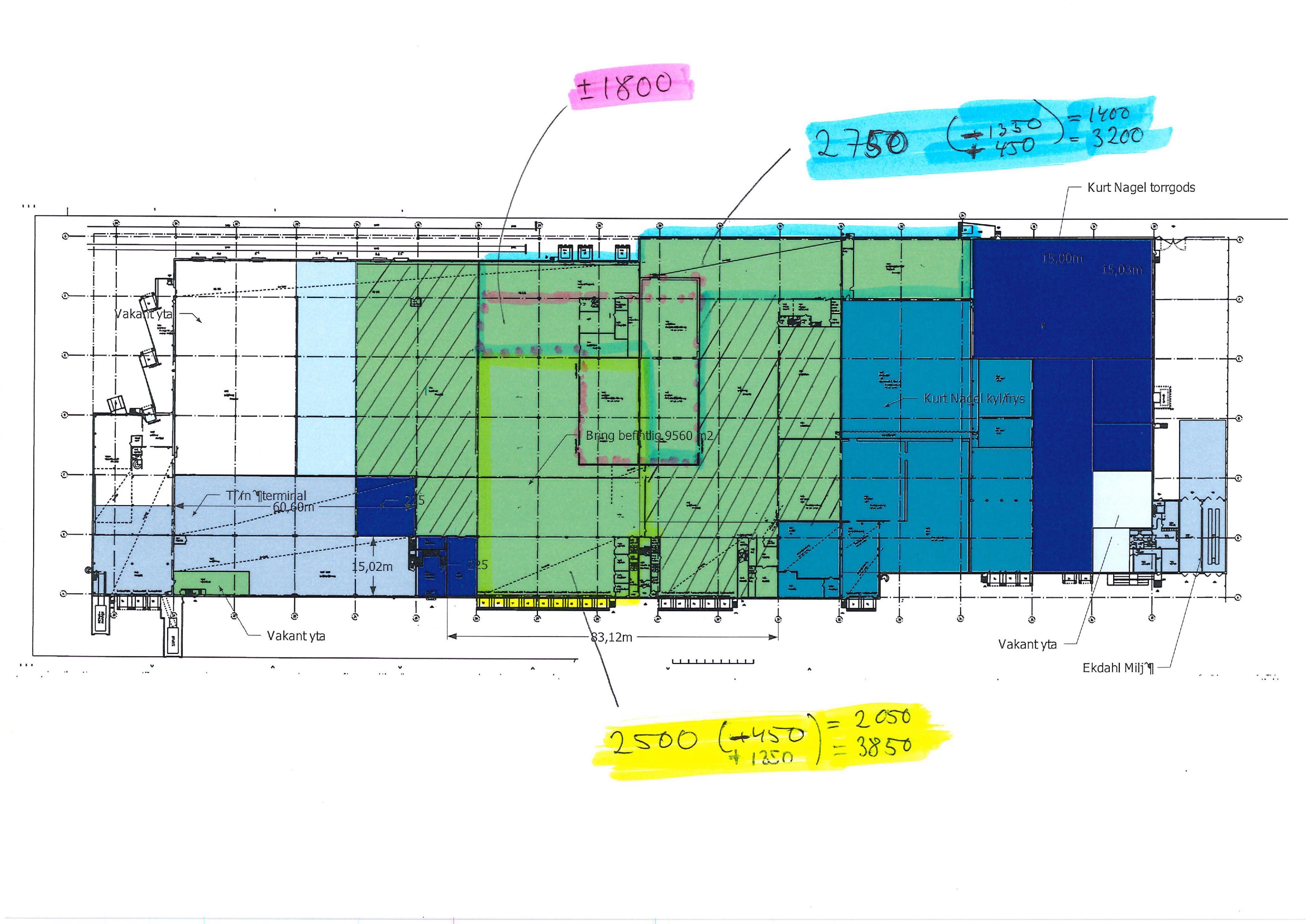 Choose from 1400 m2 - 5250 m2 of storage area with head room of 4,5-6,5m. At the moment, partly built for storage of flammable goods. In total 12 gates whereof 9 within a fenced area on the front end of the building suitable for 25m carriage, and 3 gates with public access on the back end of building. Only trailer traffic works on the back end of building, i.e. 17m carriage. A maximum capacity of 180 000 litres can be stored. Own access to office and terminal. Common access to dress rooms and lunch room.